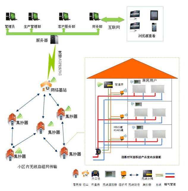 室溫控制器與通斷控制器通常采用無線470MHz頻段通訊;閥門控制器與終端服務(wù)器采用MBUS+GPRS進(jìn)行通信,實(shí)現(xiàn)熱量分?jǐn)偂?br />